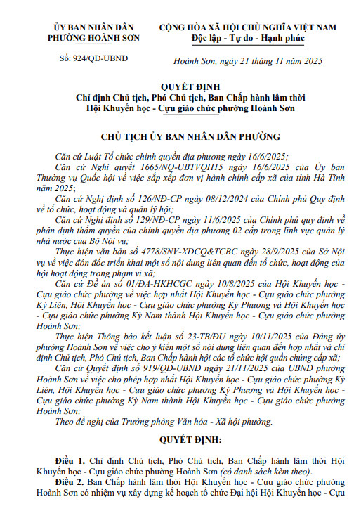 Chủ tịch UBND phường ban hành quyết định số 921, 922, 924, 924/QĐ-UBND, ngày 21/11/2025 về Chỉ định Chủ tịch, Phó Chủ tịch, Ban Chấp hành lâm thời Hội người cao tuổi, Hội Liên hiệp Thanh niên Việt Nam phường Hội Cựu Thanh niên xung phong, Hội Khuyến học - Cựu giáo chức phường Hoành Sơn