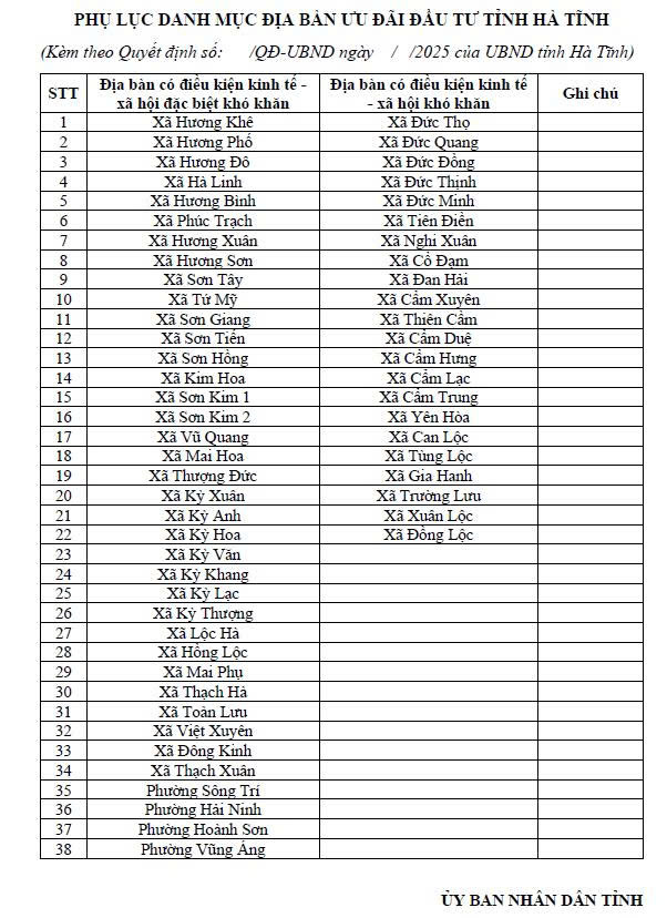 Công bố địa bàn ưu đãi đầu tư trên địa bàn tỉnh Hà Tĩnh
