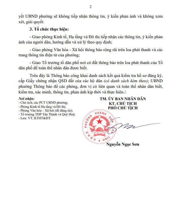 Công khai kết quả kiểm tra hồ sơ cấp Giấy CNQSD đất, quyền sở hữu tài sản gắn liền với đất tại TDP Tân Thành và TDP Quý HuệNgọc Oanh24/04/2026A -A+Ngọc Oanh24/04/2026A -A+Ủy ban nhân dân phường Hoành Sơn công khai kết quả kiểm tra hồ sơ đăng ký, cấp Giấy chứng nhận như sau: