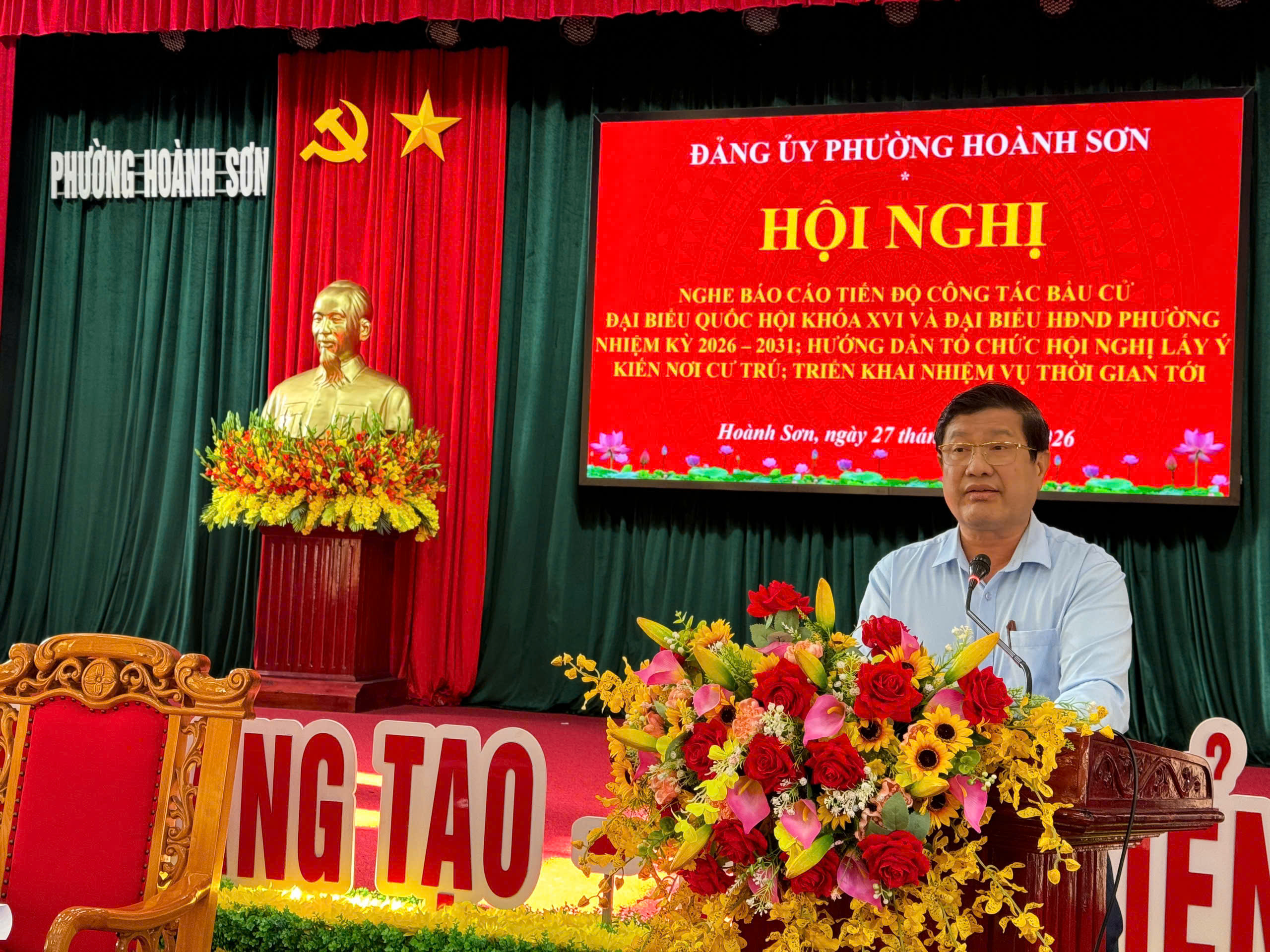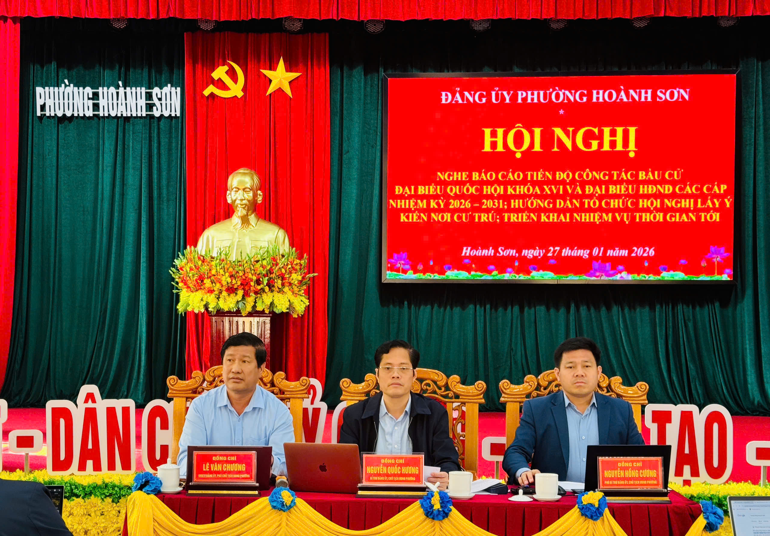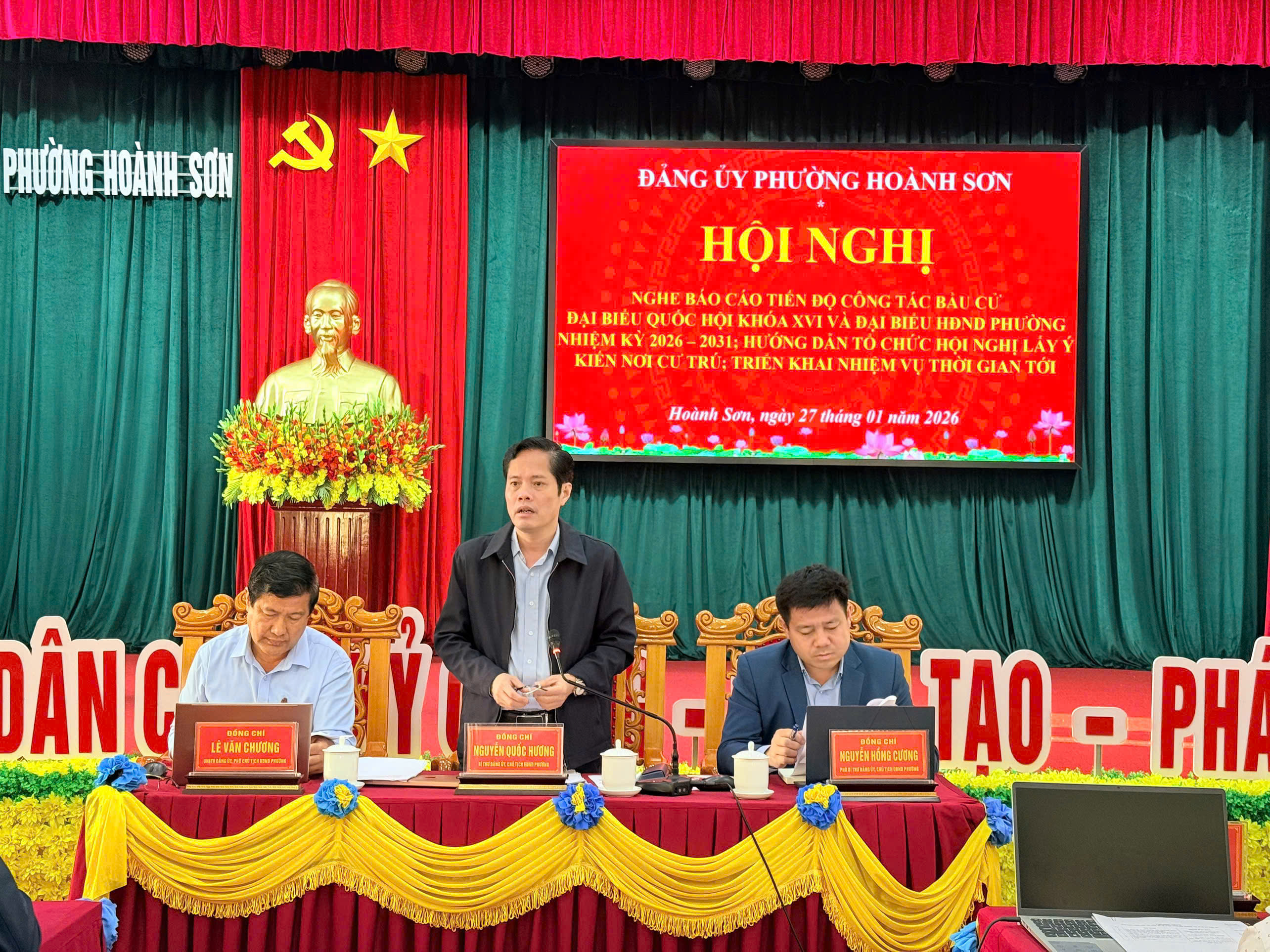 Đồng chí Nguyễn Quốc Hương - Bí thư Đảng ủy, Chủ tịch HĐND phường, Trưởng Ban Chỉ đạo, Chủ tịch Ủy ban bầu cử phường; đồng chí Nguyễn Hồng Cương - Phó Bí thư Đảng ủy, Chủ tịch UBND phường, Phó Trưởng Ban Chỉ đạo, Phó Chủ tịch UBBC phường; đồng chí Lê Văn Chương - Ủy viên BTV Đảng ủy, Phó Chủ tịch HĐND phường, Phó Chủ tịch Thường trực UBBC phường đồng chủ trì hội nghị.