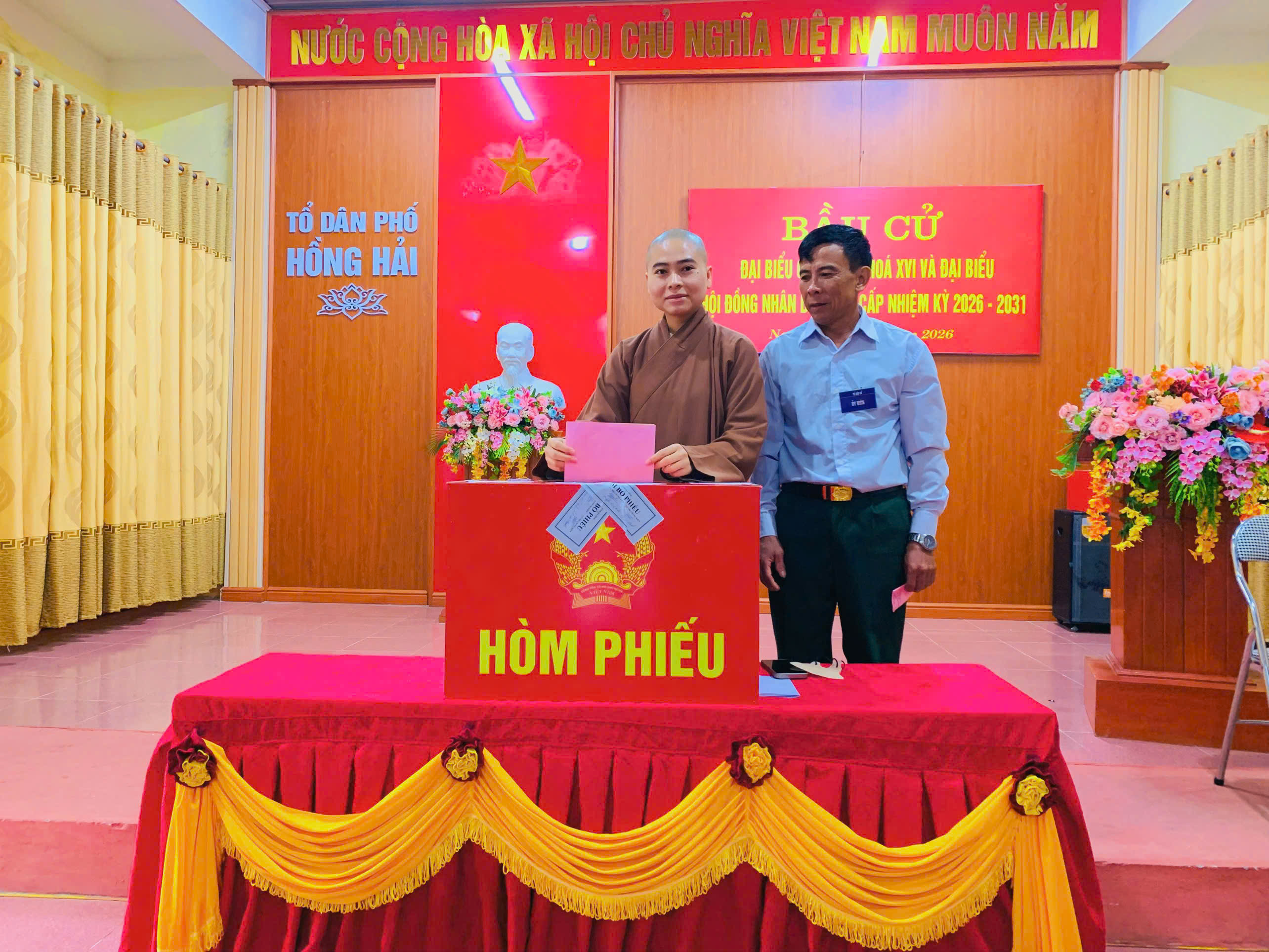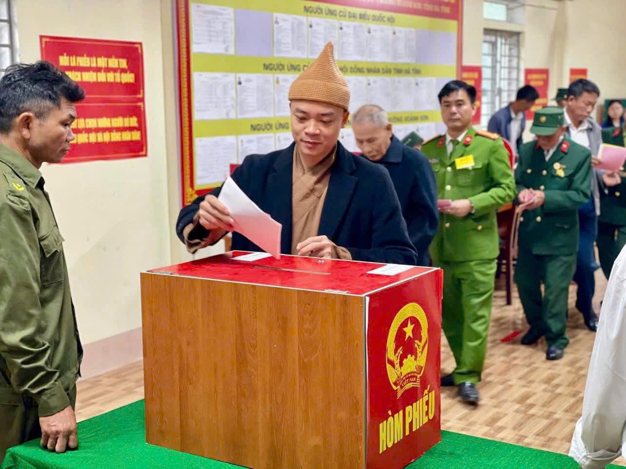 Đại đức Thích Tục Hoan - Phó Chánh Văn phòng phật giáo tỉnh Hà Tĩnh - Trụ trì chùa Thanh Phúc - Đèo Ngang tham gia bầu cử tại khu vực bỏ phiếu số 19 TDP Tân Thành