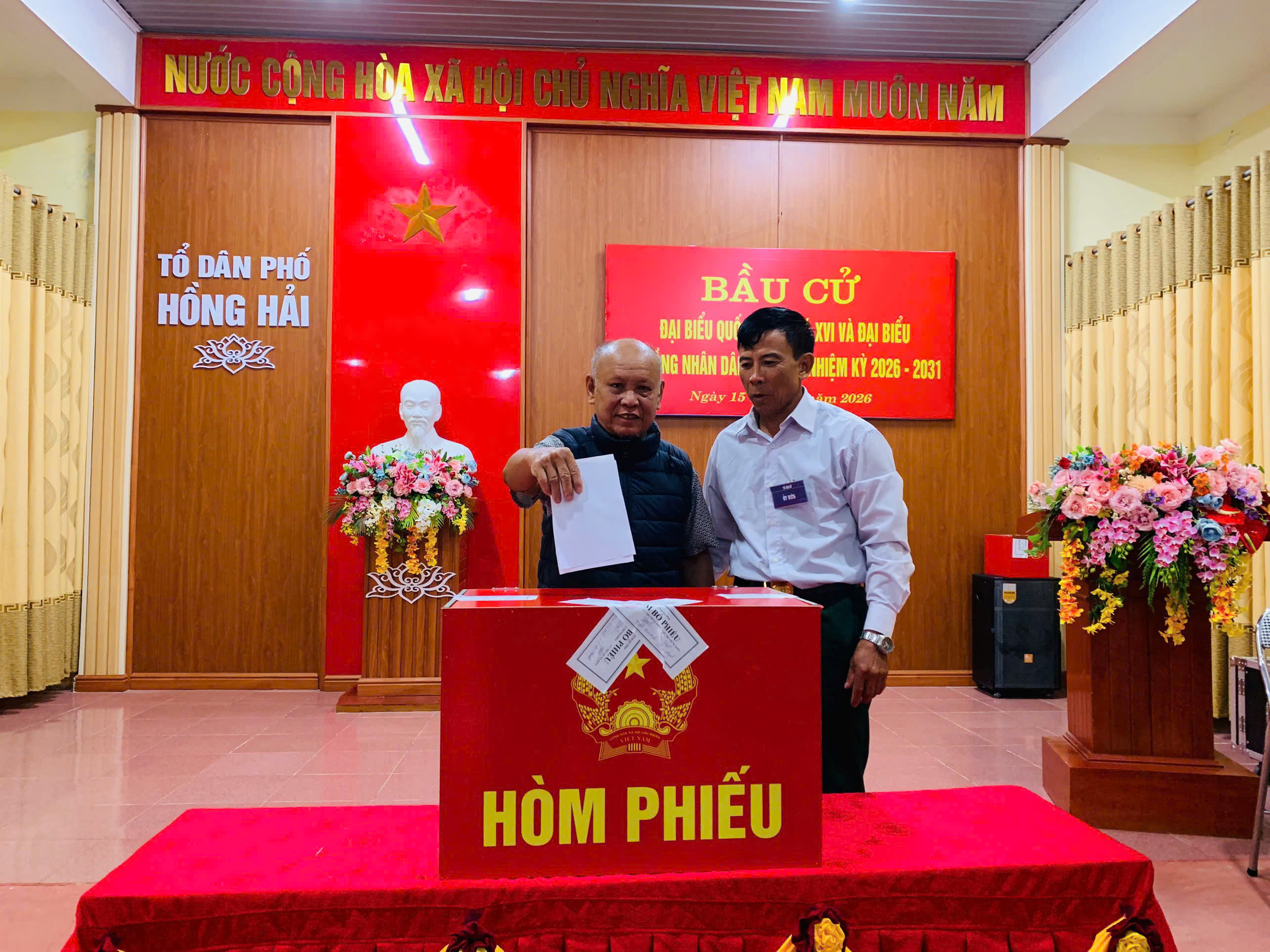 Đồng chí Phạm Văn Hùng - Phó Bí thư Thường trực Đảng ủy; đồng chí Nguyễn Ngọc Sơn - UVBTV - Phó Chủ tịch UBND phường, Trưởng Ban bầu cử số 02 tham dự khai mạc bầu cử đại biểu Quốc hội khóa XVI và đại biểu HĐND các cấp nhiệm kỳ 2026 - 2031 tại khu vực bỏ phiếu số 11 TDP Thắng Lợi (phường Hoành Sơn)