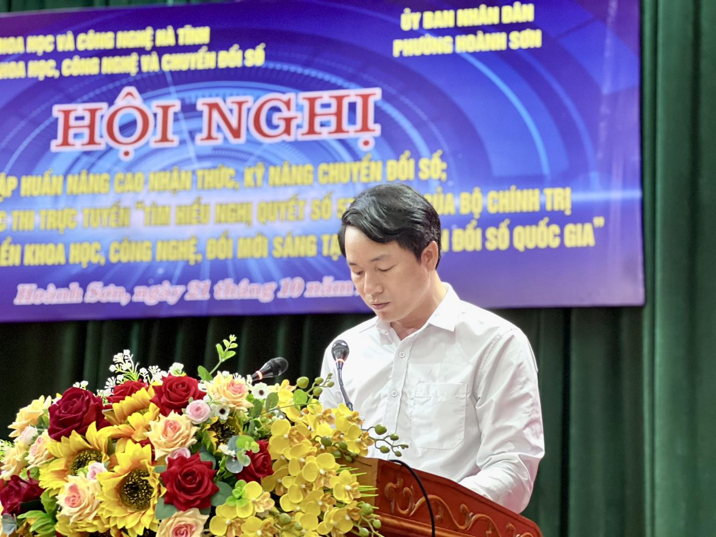 Về tham dự và truyền đạt nội dung tại Hội nghị có đồng chí Trần Xuân Sơn - Trưởng phòng Truyền thông và Đổi mới sáng tạo - Trung tâm Khoa học Công nghệ và chuyển đổi số Hà Tĩnh, cùng các thành viên chuyên viên của phòng. Các chuyên gia đã truyền đạt những nội dung cốt lõi về chuyển đổi số, vai trò của khoa học công nghệ và đổi mới sáng tạo, cũng như hướng dẫn chi tiết cách thức tham gia các cuộc thi trực tuyến.