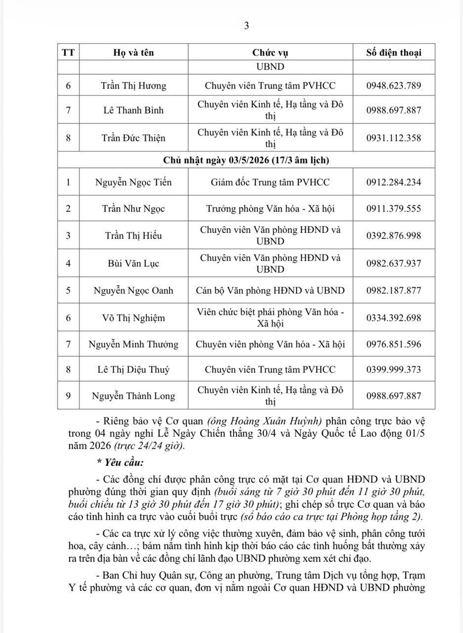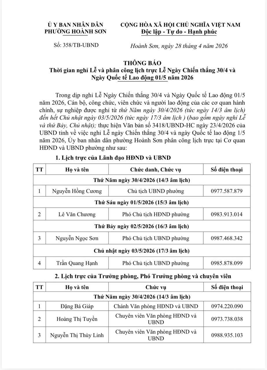 Trong dịp nghỉ Lễ Ngày Chiến thắng 30/4 và Ngày Quốc tế Lao động 01/5 năm 2026, Cán bộ, công chức, viên chức và người lao động của các cơ quan hành chính, sự nghiệp được nghỉ từ thứ Năm ngày 30/4/2026 (tức ngày 14/3 âm lịch) đến hết Chủ nhật ngày 03/5/2026 (tức ngày 17/3 âm lịch ) (bao gồm ngày nghỉ Lễ và thứ Bảy, Chủ nhật); thực hiện Văn bản số 3418/UBND-HC ngày 23/4/2026 của UBND tỉnh về việc nghỉ Lễ ngày Chiến thắng 30/4 và ngày Quốc tế lao động 1/5 năm 2026