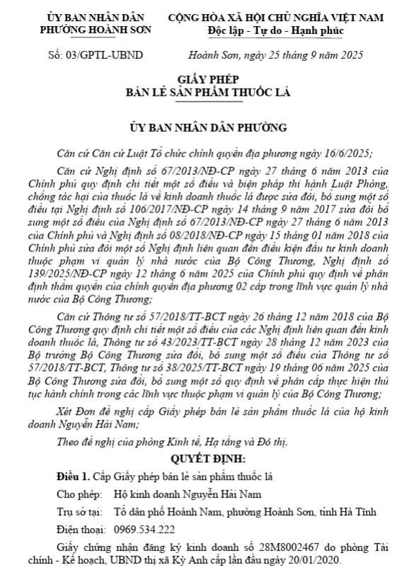 THỰC HIỆN CẤP PHÉP KINH DOANH CÁC SẢN PHẨM THEO QUY ĐỊNHBBT25/09/2025A -A+BBT25/09/2025A -A+UBND phường thực hiện việc cấp phép bán lẻ sản phẩm thuốc lá cho các hộ Kinh doanh trên địa bàn phường